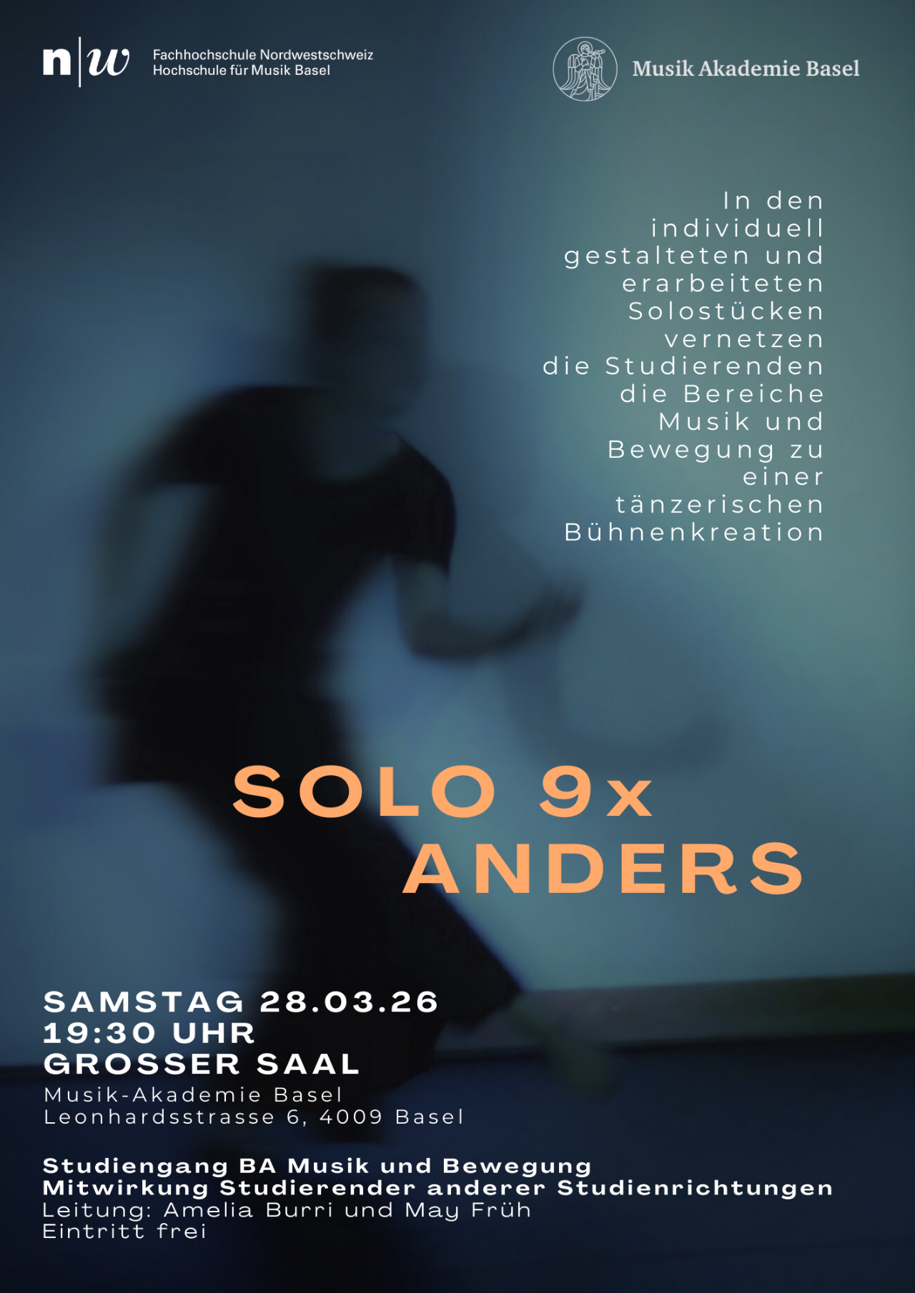 In Auseinandersetzung mit ihrem eigenen Ausdruck und der Musik schaffen die Studierenden eine Solotanzchoreographie im lebendigen Dialog mit den Musiker*innen auf der Bühne.